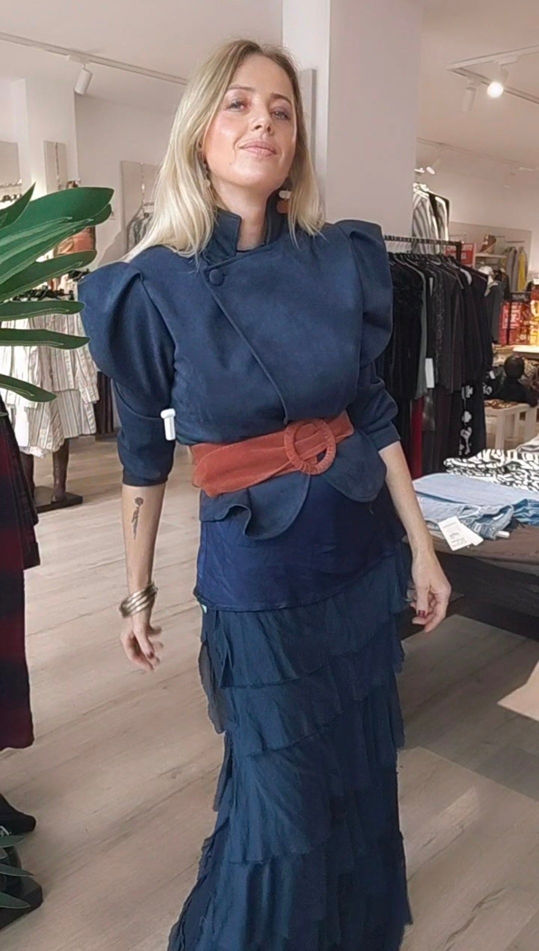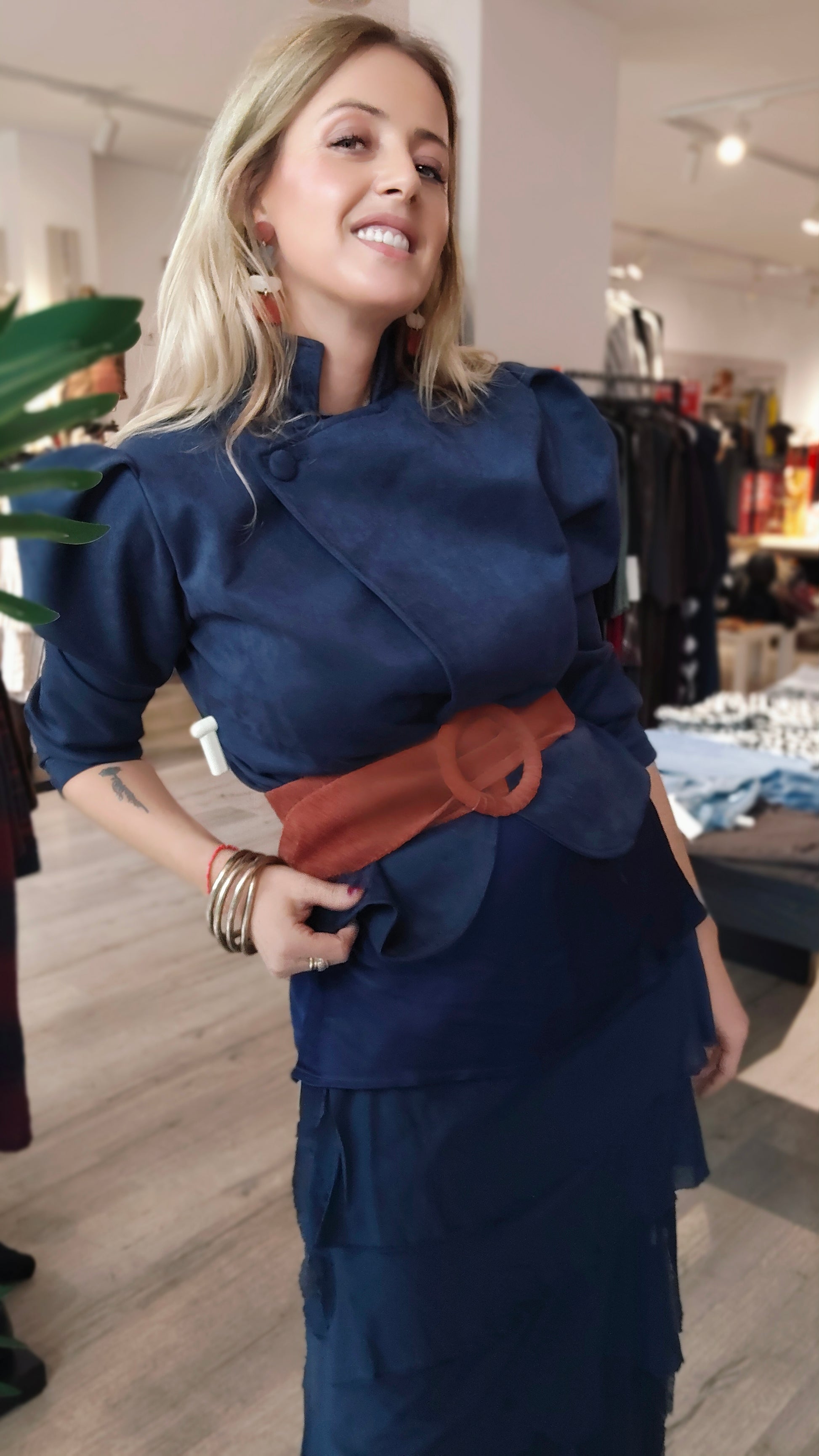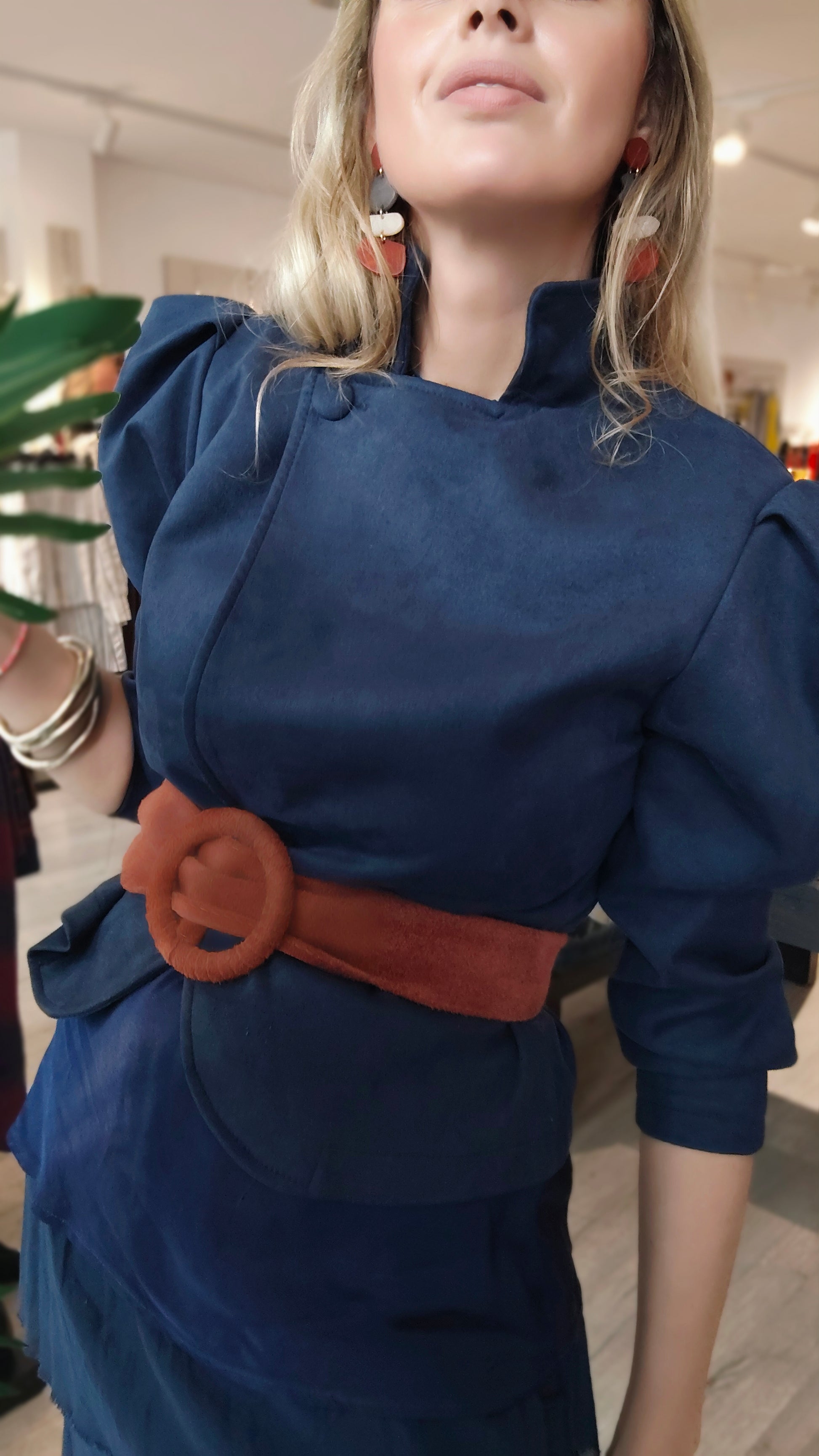 CHAQUETA EFECTO ANTE, CIERRE ASIMÉTRICO Y BOTONONES AL TONO, MANGAS ABULLONADAS,